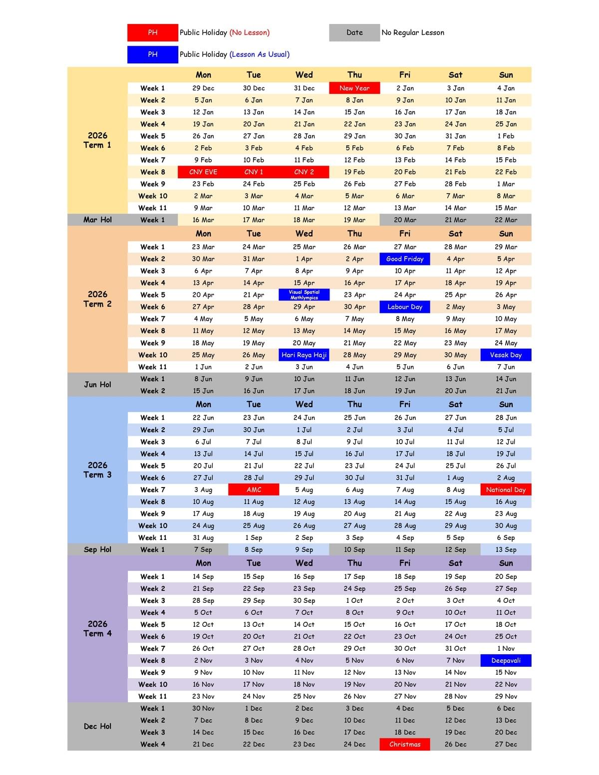 Here's the calendar for weekly classes of The Math Classroom in 2026.