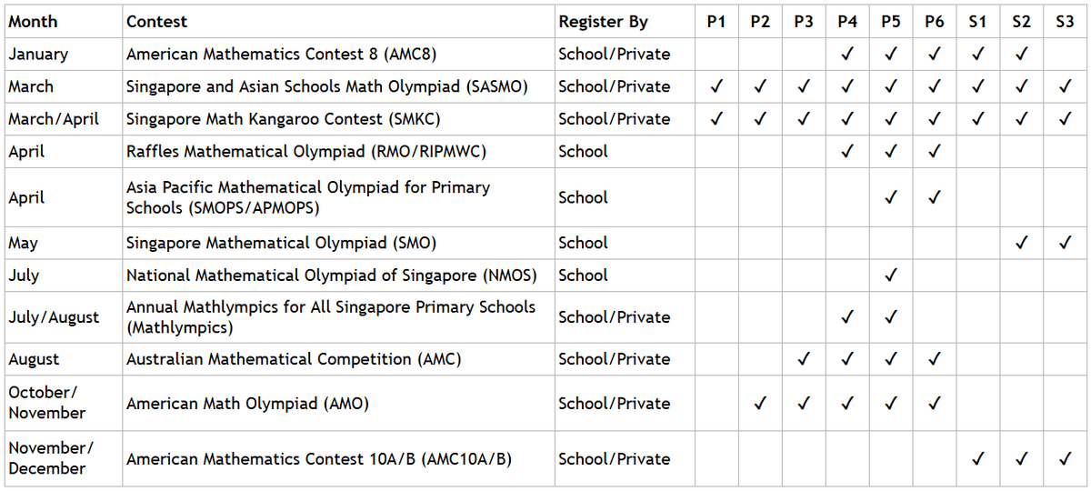 Advanced mathematics program building on the school math curriculum. Skills gained are useful for math competitions and olympiads such as SASMO, NMOS, SMOPS and RIPMWC, Mathlympics, AMC and AMC8.