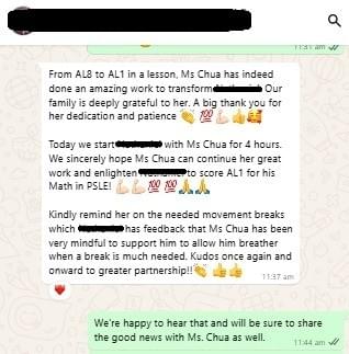 explains math concepts clearly. She is very patient and well-liked by all her students. She offers math advice to students even during out of normal class hours. I are extremely grateful for her help and I'm confident in obtaining As in this year's PSLE Math."